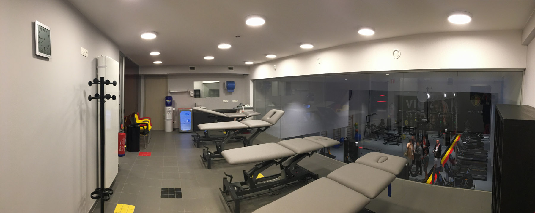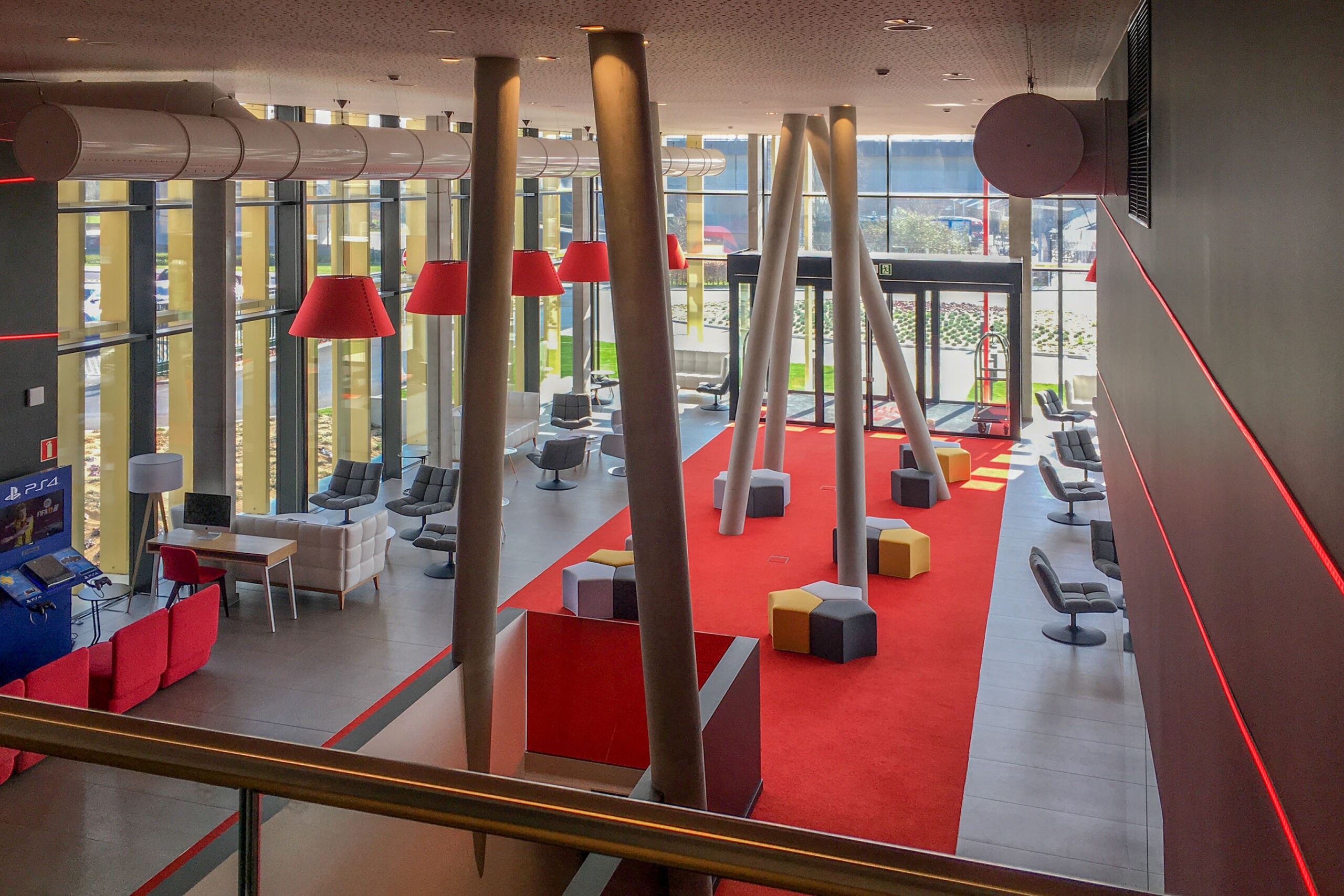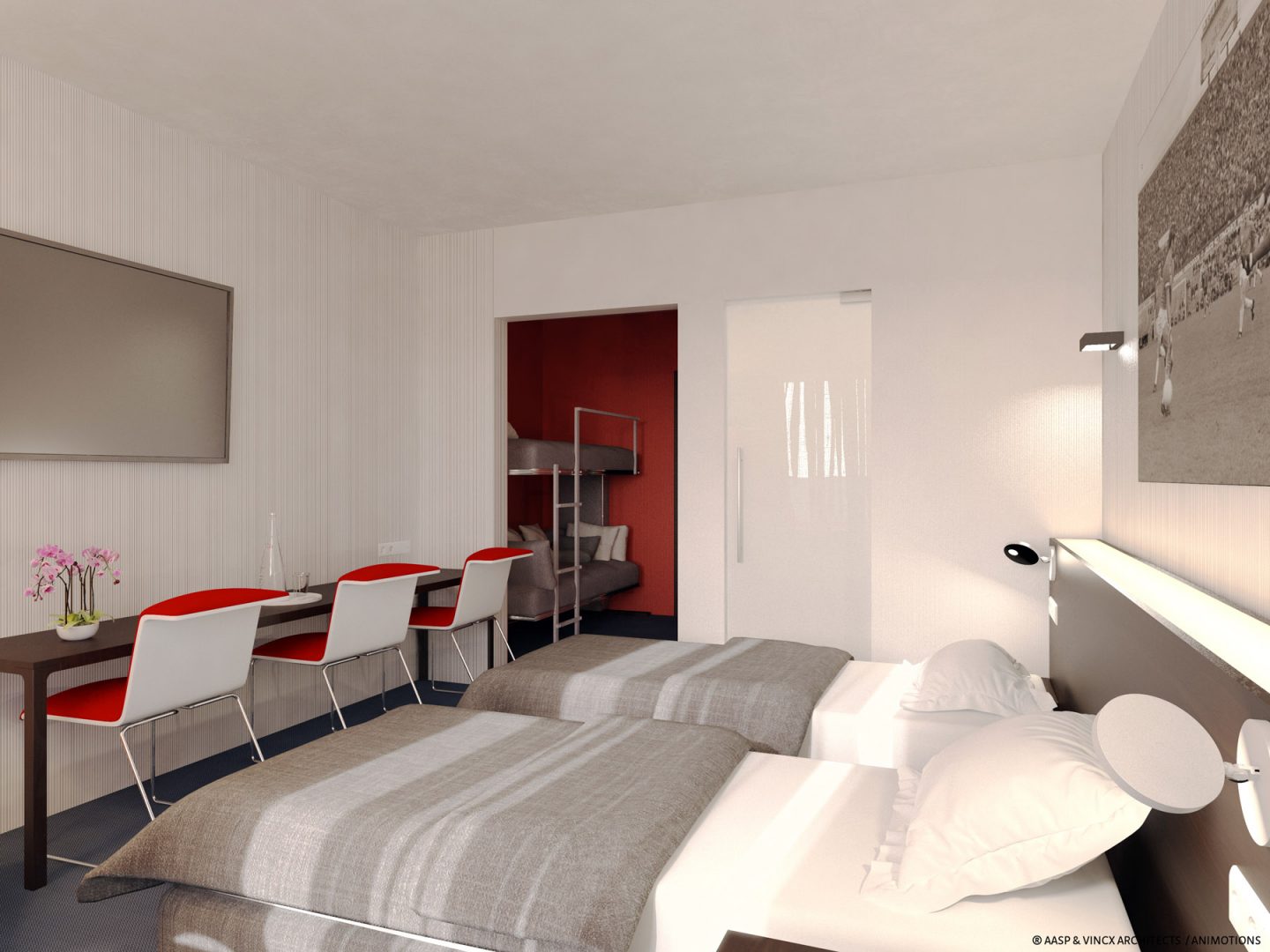 L’espace de l’hôtel a été agencé de telle manière que le public et les joueurs de foot ne se côtoient à aucun moment, en d’autre terme, une circulation privatisée est prévue pour ces derniers. Le complexe, utilisé à 30% par le football, détient 79 chambres, deux salles de fitness, six salles de réunion, un auditorium de 160 places, un centre médical, un espace d’accueil et de restauration. La composition structurelle désaxée, l’éclairage et le mobilier offre une dynamique spatiale et un jeu géométrique aux couleurs nationales.