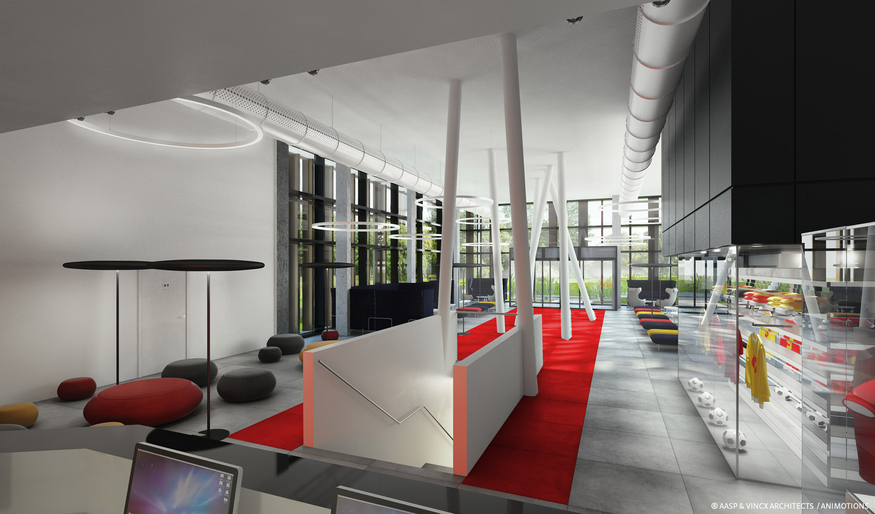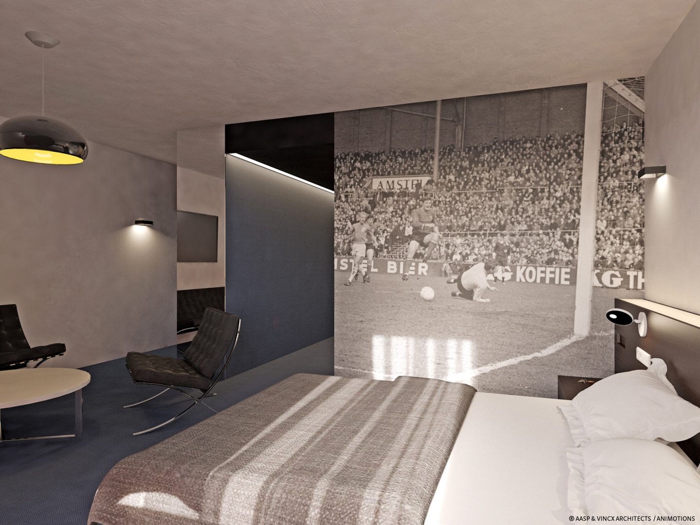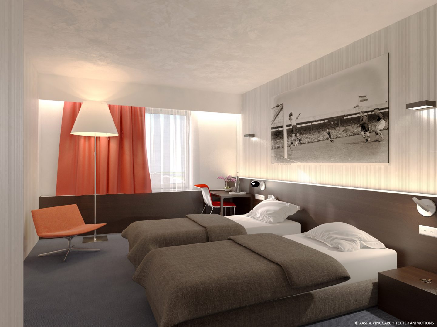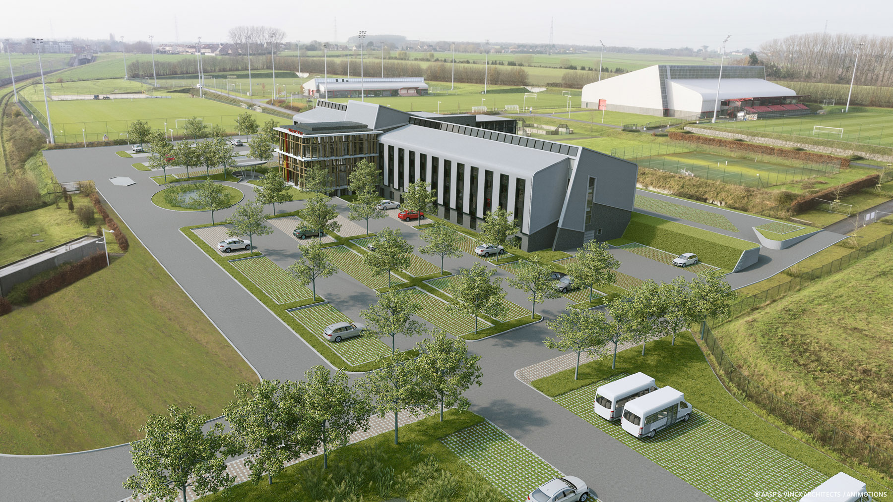 L’intervention architecturale se déroule en deux temps : la première est centrée sur cet ancien bâtiment industriel rénové en hôtel et agrandi de 1000 m² pour accueillir tant du public que les équipes de football belges. La deuxième, projetée dans le futur, serait de créer une jonction entre l’hôtel et le centre omnisport situé à proximité.