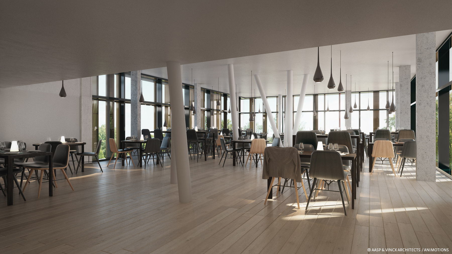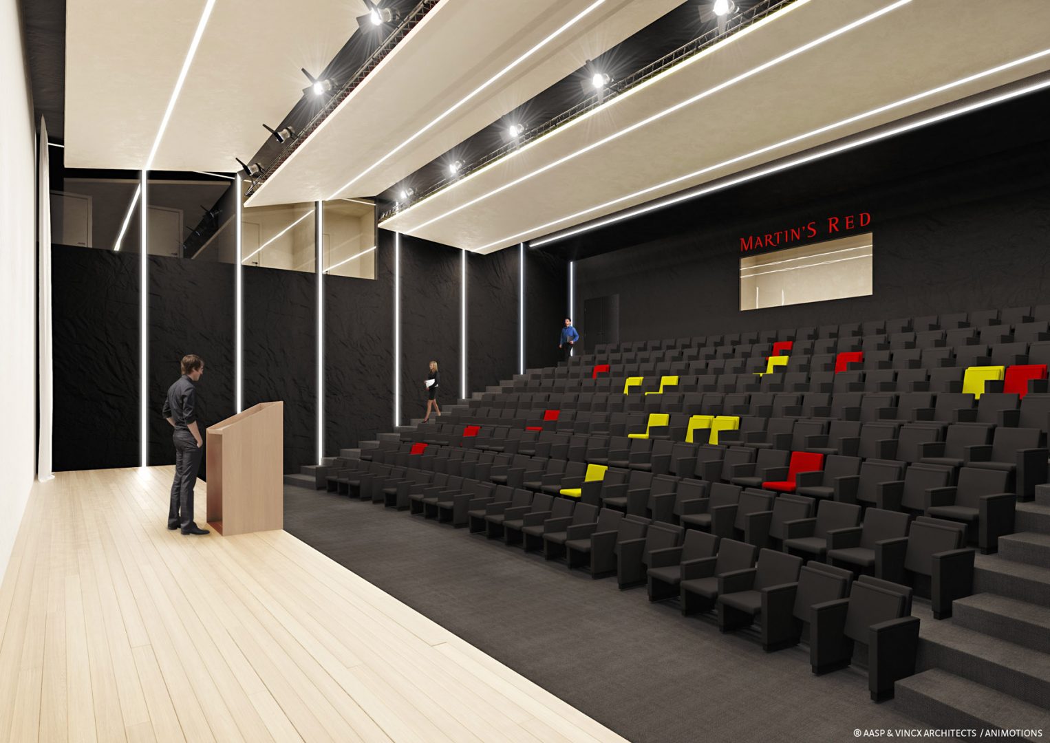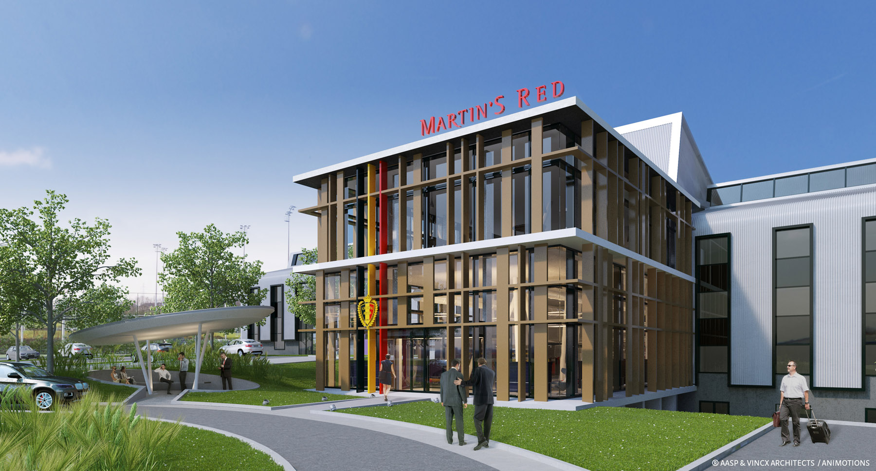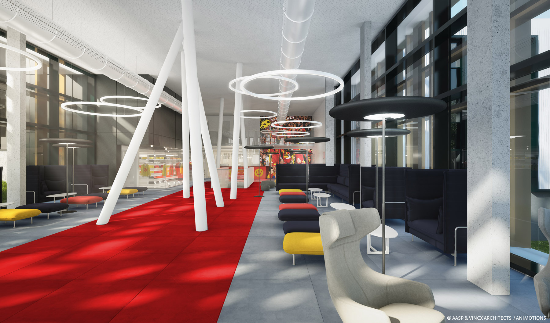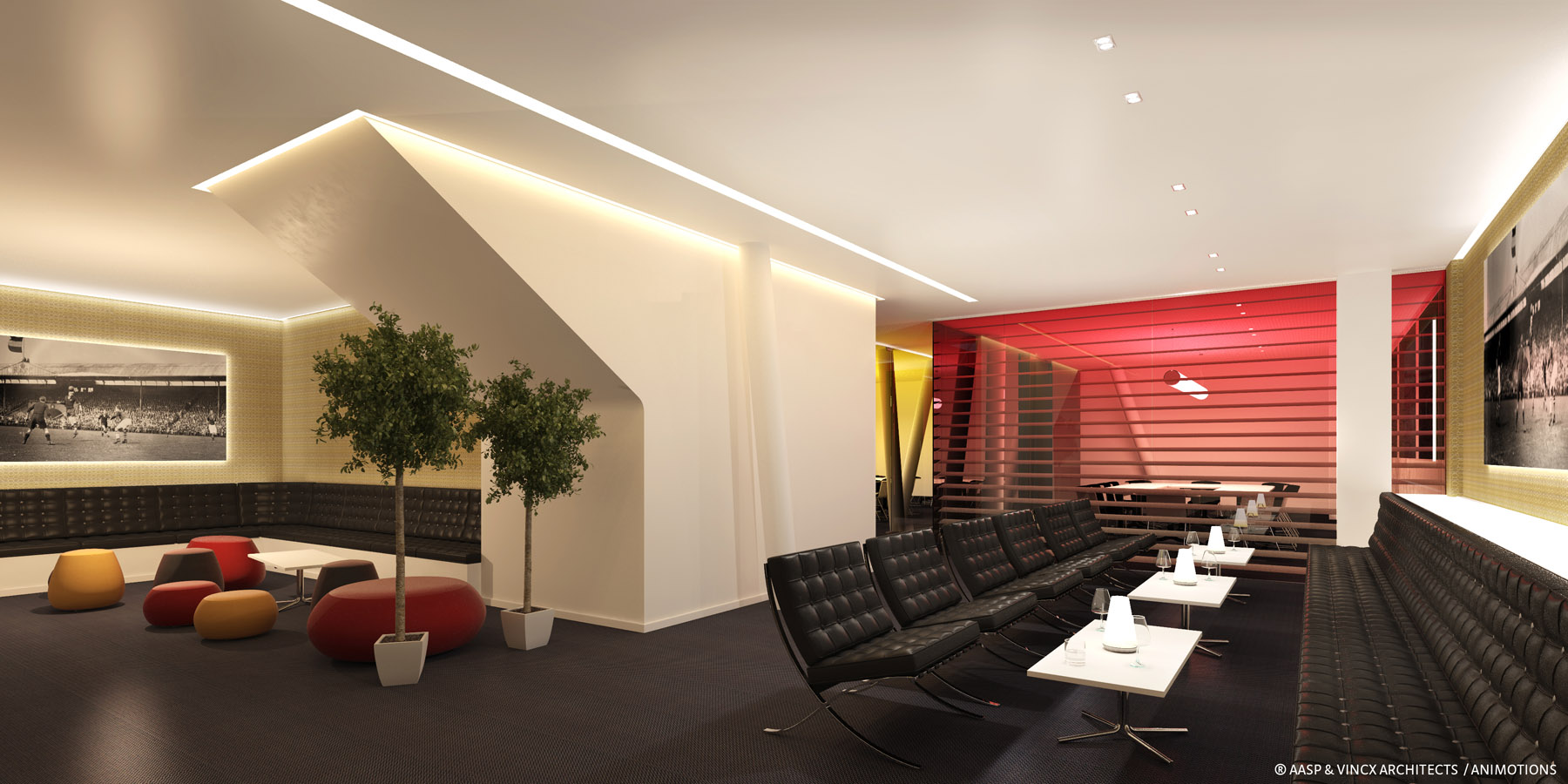 L’intervention architecturale se déroule en deux temps : la première est centrée sur cet ancien bâtiment industriel rénové en hôtel et agrandi de 1000 m² pour accueillir tant du public que les équipes de football belges. La deuxième, projetée dans le futur, serait de créer une jonction entre l’hôtel et le centre omnisport situé à proximité.