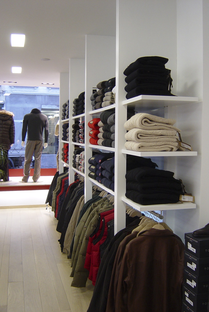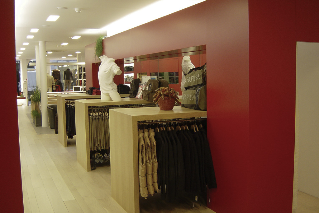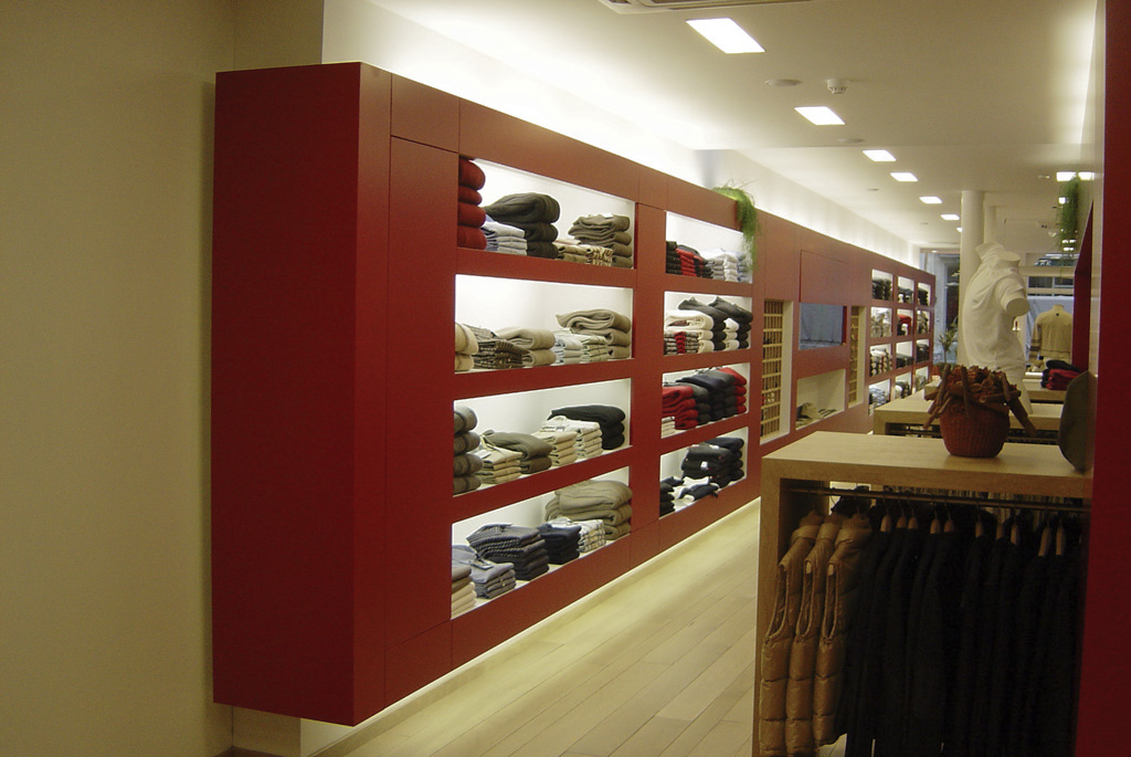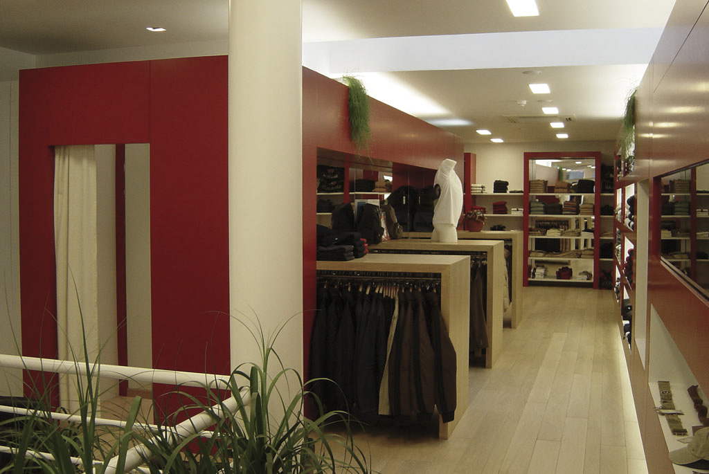 Ce magasin de vêtements relie physiquement et visuellement deux bâtiments et ce, par la création d’un mobilier flottant. Ce dernier a été entièrement conçu sur mesure et une attention particulière a été donné à l’aménagement de l’espace. Les miroirs créent un effet d’agrandissement et le choix de l’éclairage accentue ce travail de précision et les lignes droites du projet.